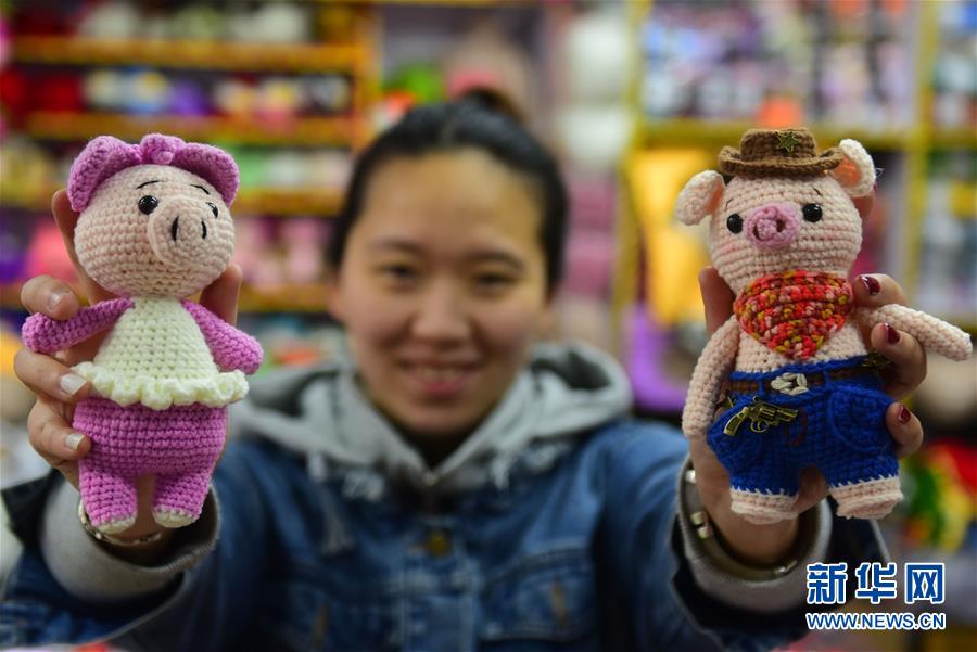 1月9日,江苏无锡创业青年章雯艳在展示自己用毛线编织的卡通猪玩偶。 春节临近,人们忙着制作节庆用品、手工艺品等,喜迎新春佳节。 新华社发(还月亮 摄)