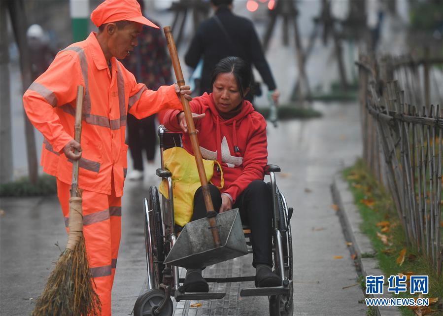 1月9日,董锦香帮董基东运送用来清扫路面的工具。 新华社记者 宋为伟 摄