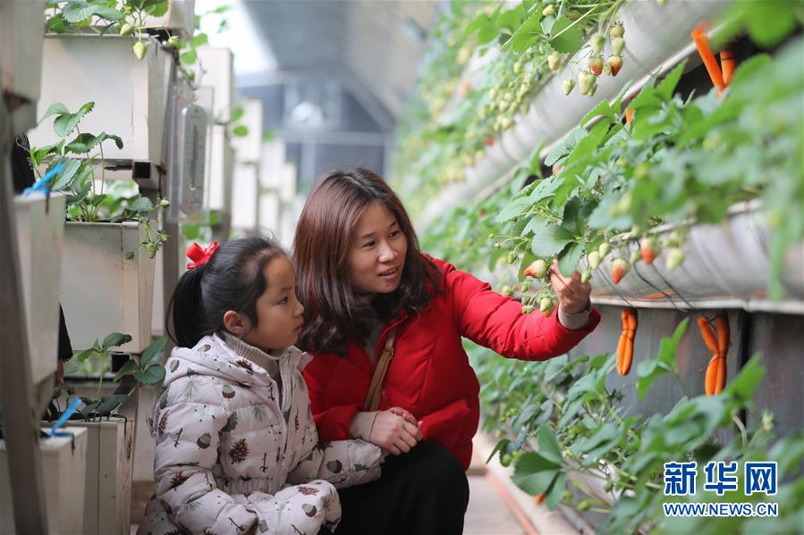 1月9日,在河北石家庄市井陉县上安镇一家现代农业园内,生长中的草莓吸引了小朋友的目光。 新华社发(王保龙 摄)