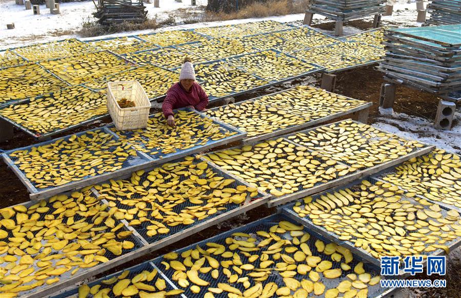 1月10日,山东省枣庄市水泉镇倪山口村农民在晾晒地瓜干。 时值三九,山东省枣庄市水泉镇农民抓住雪后天晴的有利时机,冒着严寒加工、晾晒地瓜干。金黄色的地瓜干为冬日山村增添了一抹亮色。 新华社发(刘明祥 摄)