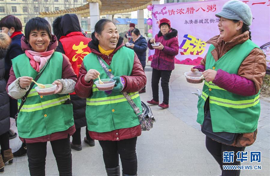 腊八节前夕,河北省永清县城区街道组织志愿者熬制腊八粥,免费分送给社区空巢老人、外来务工人员及其他社区居民,让他们感受到冬日的温暖。