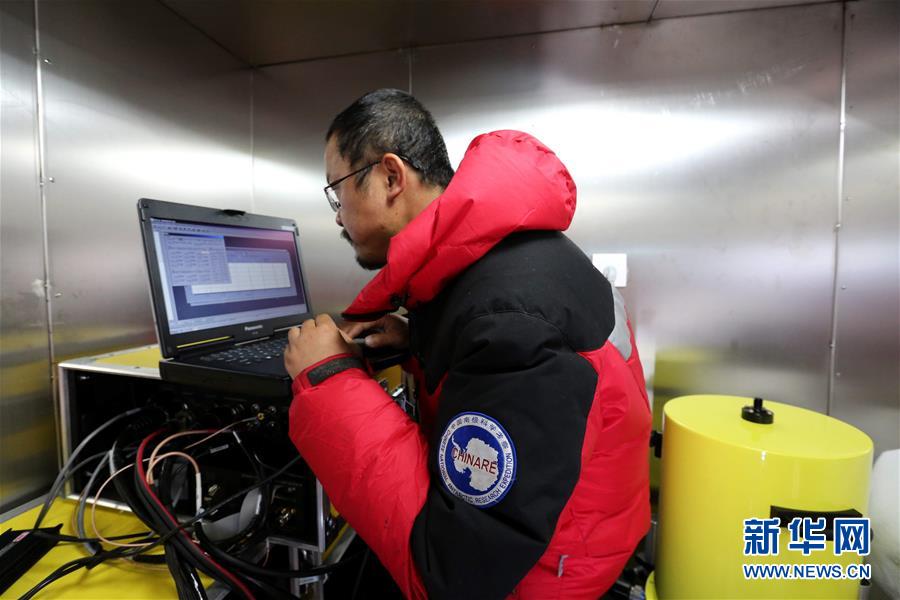 1月10日,科考队员杨元德在保温舱内进行绝对重力测量。