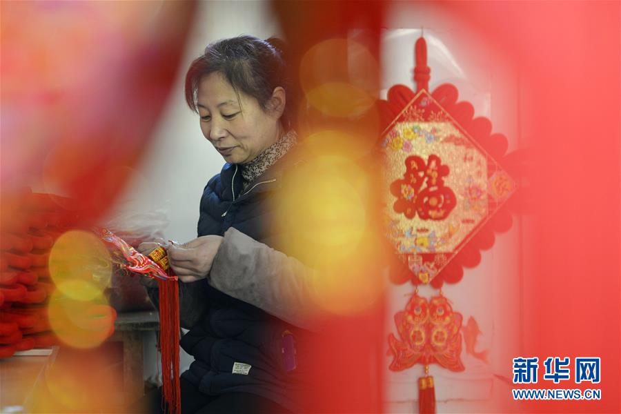 1月10日,在河北省邢台县晏家屯镇心长村扶贫小院,村民王秀花为中国结悬挂流苏。 新华社发(陈雷 摄)