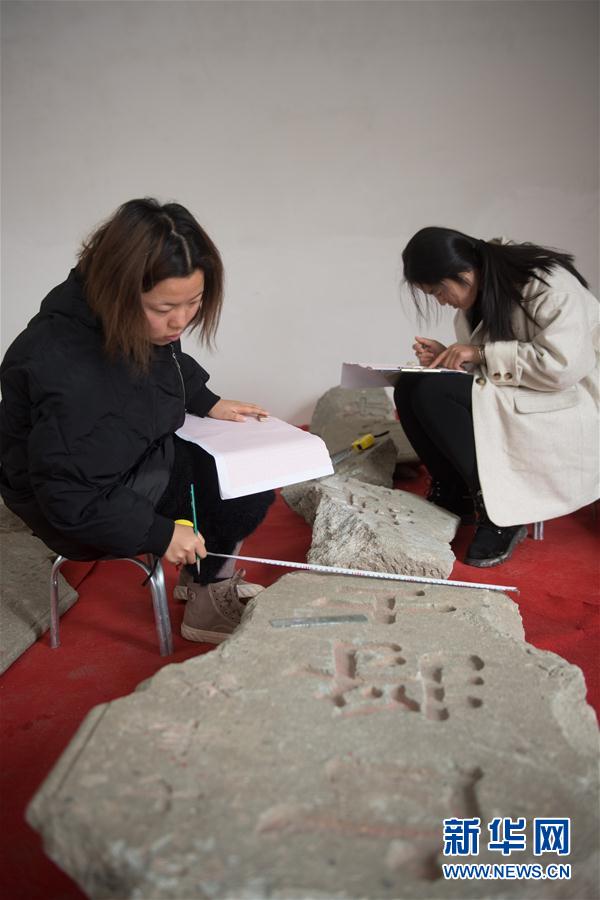 1月10日,考古工作人员在梅城镇对收集到的牌坊石构件进行测量归档。 浙江省建德市梅城镇是古严州府所在地。为配合美丽城镇建设,重现历史文脉,2018年8月起杭州市园林文物局派考古人员进驻梅城展开考古工作。目前,考古工作人员已收集牌坊石构件3021件,完成2757平方米的古水系勘探工作,为探索严州古城整体格局进行古城保护提供历史依据。 新华社记者 翁忻旸 摄