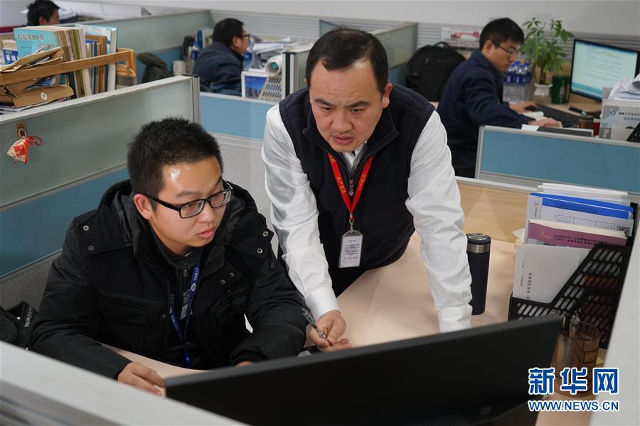 在中船重工第七〇二研究所,叶聪(右)在指导同事工作(2018年12月24日摄)。 新华社记者 季春鹏 摄