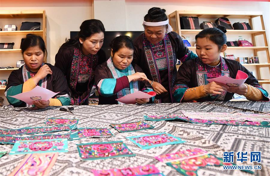1月9日,在三江侗族自治县清花绣坊,滚培衣(右三)在展示刺绣技艺。新华社发(黎寒池 摄)