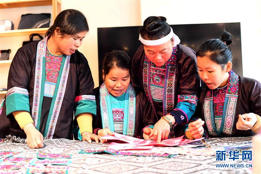 1月9日,在三江侗族自治县清花绣坊,滚培衣(右三)和其他绣娘现场交流刺绣技艺。新华社发(黎寒池 摄)