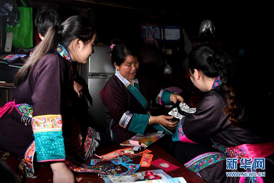 在三江侗族自治县洋溪乡勇伟村,滚培衣(中)向上门收购绣片的艺人展示她的刺绣作品(2018年4月12日摄)。新华社发(黎寒池 摄)