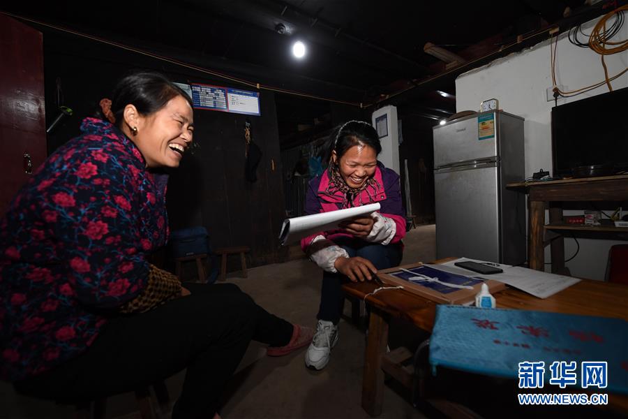 在三江侗族自治县洋溪乡勇伟村,滚培衣(左)与入户走访的村干部潘翠玲聊天(2018年12月19日摄)。新华社发(黎寒池 摄)