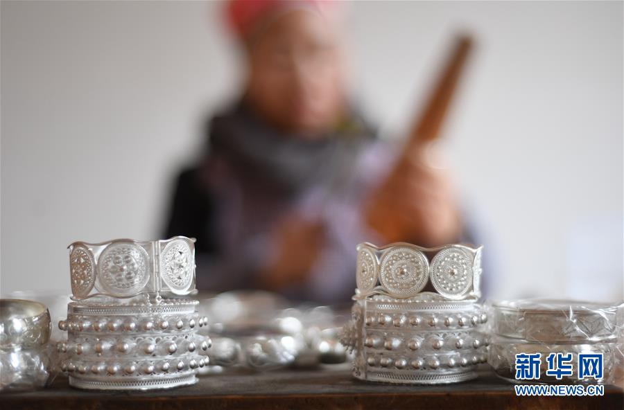 1月10日,在贵州省黔东南苗族侗族自治州凯里市一家银饰加工坊,手工艺人在制作银饰。新华社发