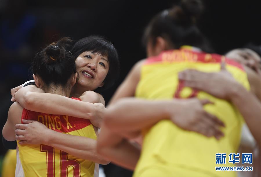 2016年8月20日,中国队主教练郎平(左二)在2016年里约奥运会女子排球决赛战胜塞尔维亚队夺冠后与队员拥抱庆祝。新华社记者李尕摄