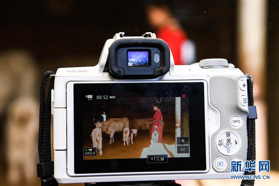 1月10日,乌音嘎在棚圈中自拍短视频。新华社记者 刘磊 摄