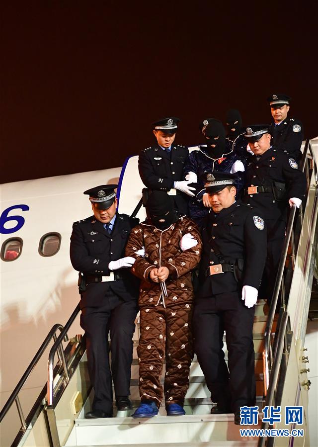 1月11日,在郑州市新郑国际机场,犯罪嫌疑人被押解下飞机。