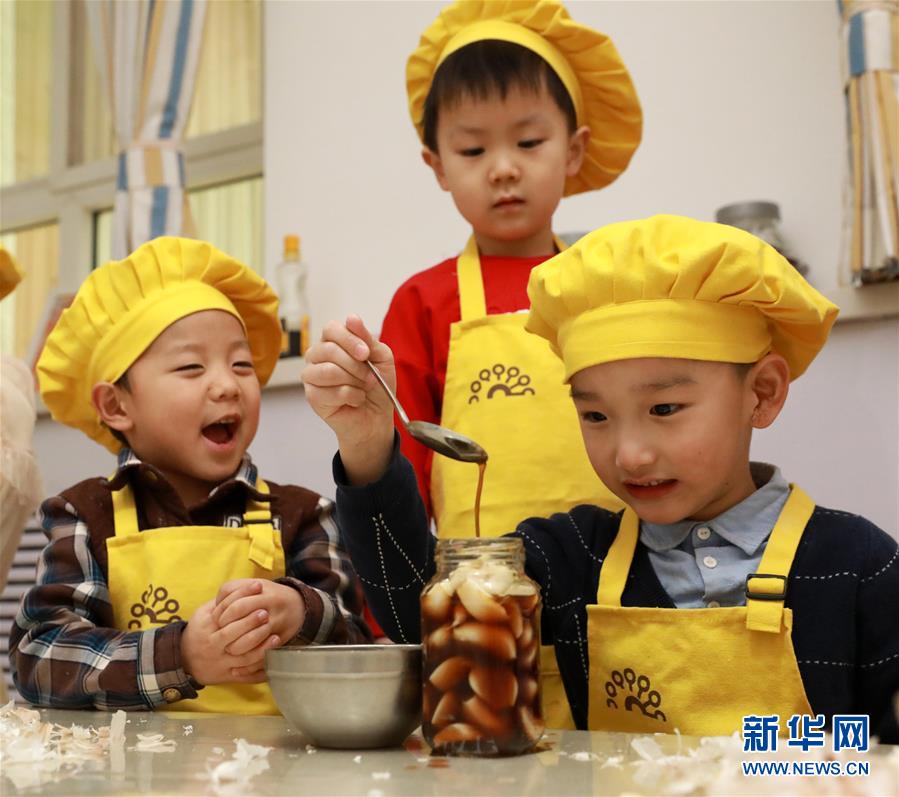 1月11日,在河北石家庄市第一幼儿园,孩子们在腌制腊八蒜。 腊八节将至,各地学校、幼儿园开展“迎腊八”主题活动,小朋友们在老师的指导下了解腊八习俗,感受传统文化魅力。 新华社发(梁子栋 摄)