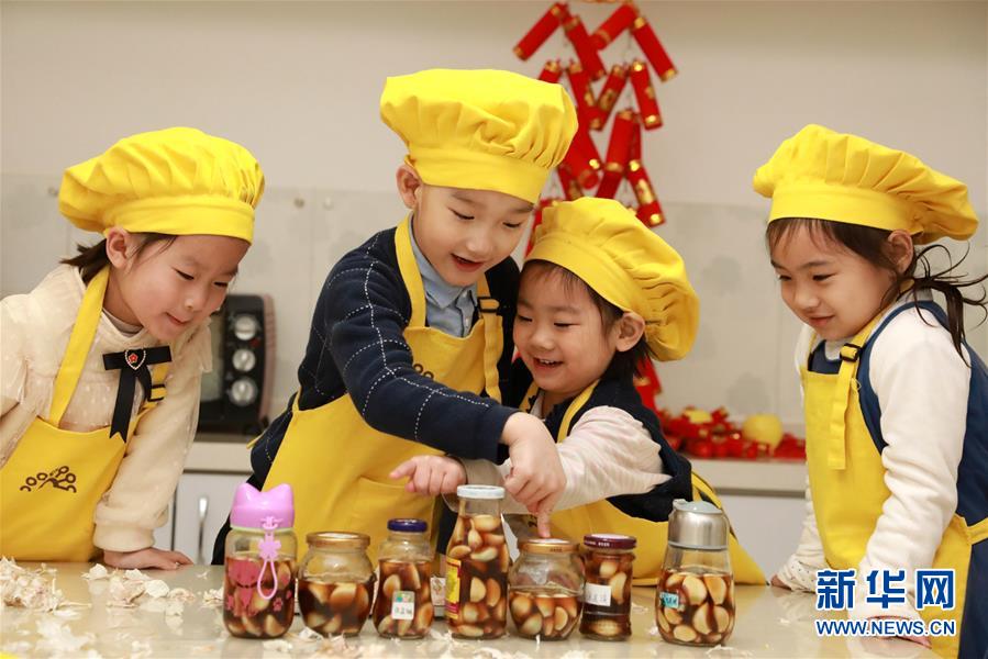 1月11日,在河北石家庄市第一幼儿园,孩子们在整理自己腌制的腊八蒜。 腊八节将至,各地学校、幼儿园开展“迎腊八”主题活动,小朋友们在老师的指导下了解腊八习俗,感受传统文化魅力。 新华社发(梁子栋 摄)