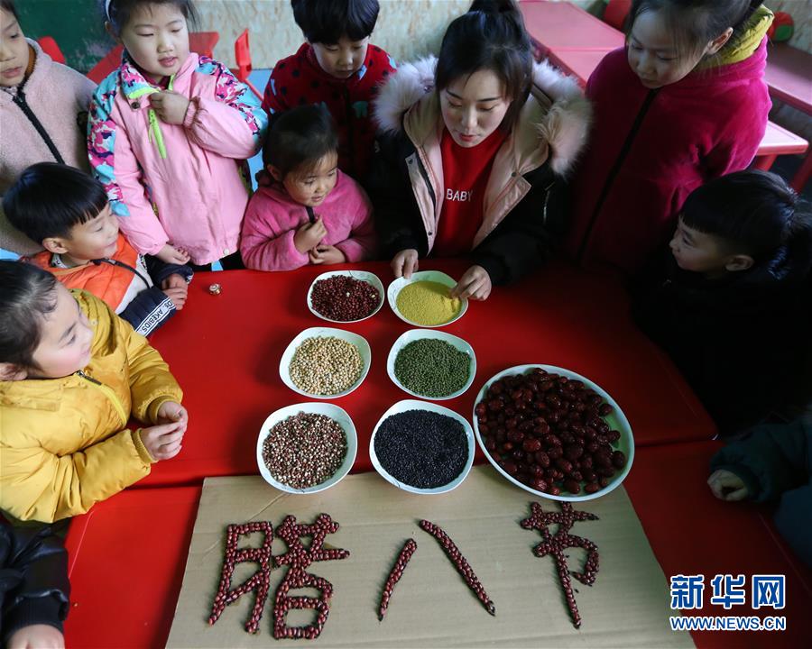 1月11日,山东省临沂市郯城县郯城街道官塘幼儿园的老师教小朋友辨认制作腊八粥的食材。 腊八节将至,各地学校、幼儿园开展“迎腊八”主题活动,小朋友们在老师的指导下了解腊八习俗,感受传统文化魅力。 新华社发(张春雷 摄)