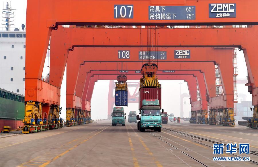 1月11日,唐山港京唐港区集装箱码头机械设备往轮船上吊装集装箱。 新华社记者 杨世尧 摄