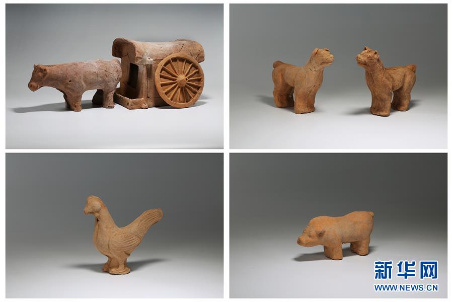 这是雷家村十六国时期墓葬出土的陶畜及陶车(拼版资料照片)。新华社发
