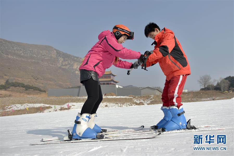 1月11日,河北邢台听障残疾人杨亚胜(右)在教练的指导下练习滑雪。 新华社发(陈雷 摄)