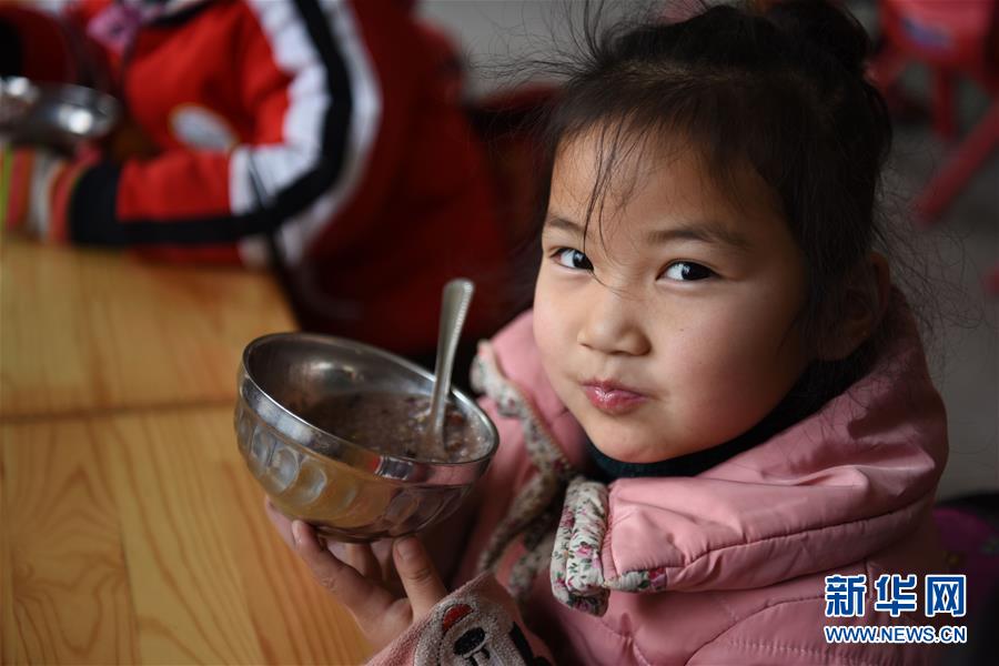 1月11日,河北省成安县徐南村幼儿园的孩子品尝腊八粥。 新华社发(武成军 摄)