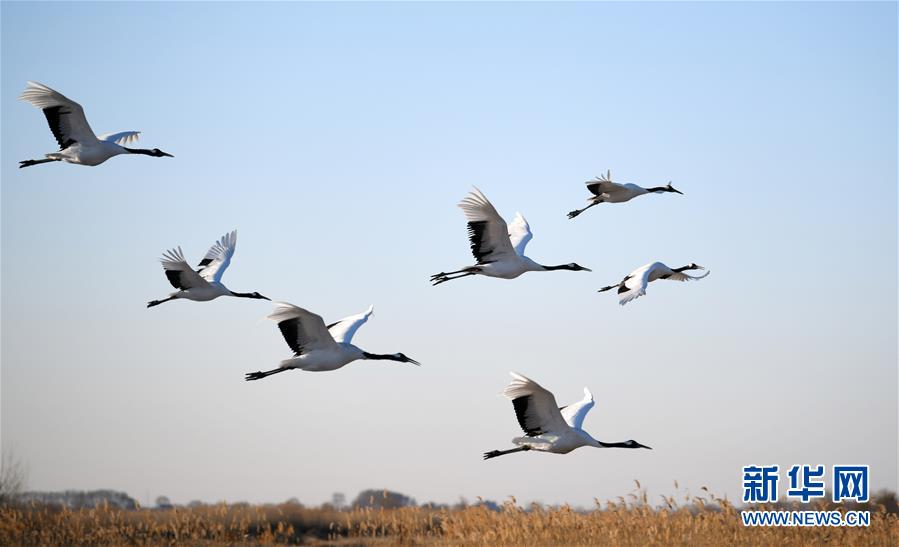 在黑龙江扎龙国家级自然保护区,一群人工繁育的丹顶鹤在空中飞翔(1月10日摄)。新华社记者王建威摄