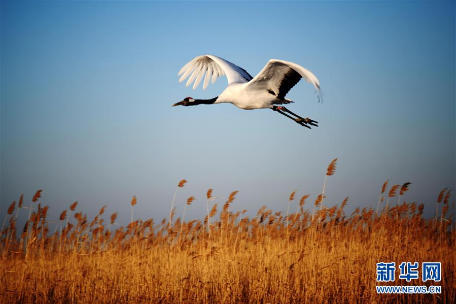 在黑龙江扎龙国家级自然保护区,一只人工繁育的丹顶鹤在空中飞翔(1月10日摄)。新华社记者王建威摄