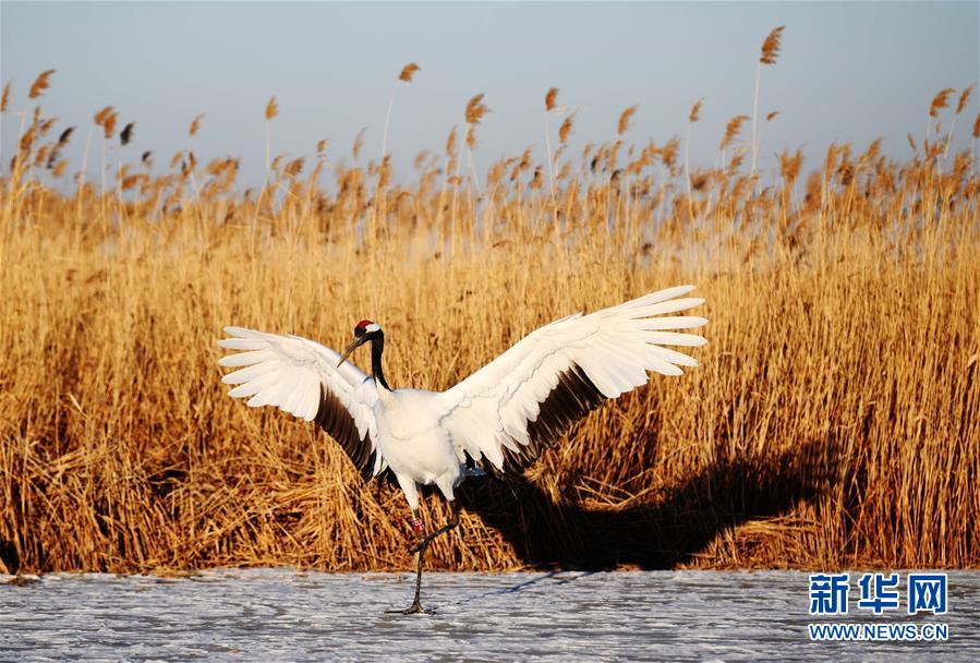 在黑龙江扎龙国家级自然保护区,一只人工繁育的丹顶鹤在冰上“起舞”(1月10日摄)。新华社记者王建威摄