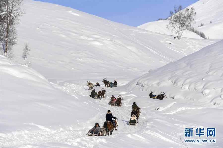 游客乘坐马拉爬犁在新疆布尔津县禾木村游玩(1月11日摄)。新华社记者 胡虎虎 摄