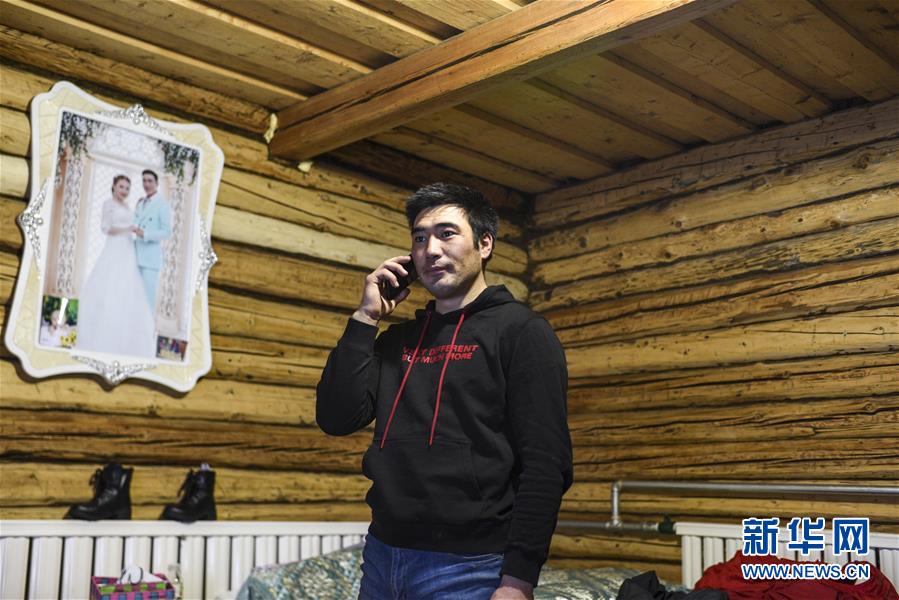 在新疆布尔津县禾木村的家中,努尔布拉提接听游客打来的预约乘坐马拉爬犁的电话(1月9日摄)。新华社记者 胡虎虎 摄