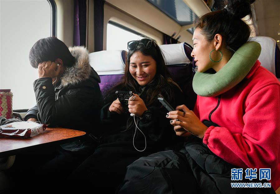 大学生刚措(右)和桑旦措姆(中)放寒假乘坐Z6802次列车回老家那曲(1月11日摄)。