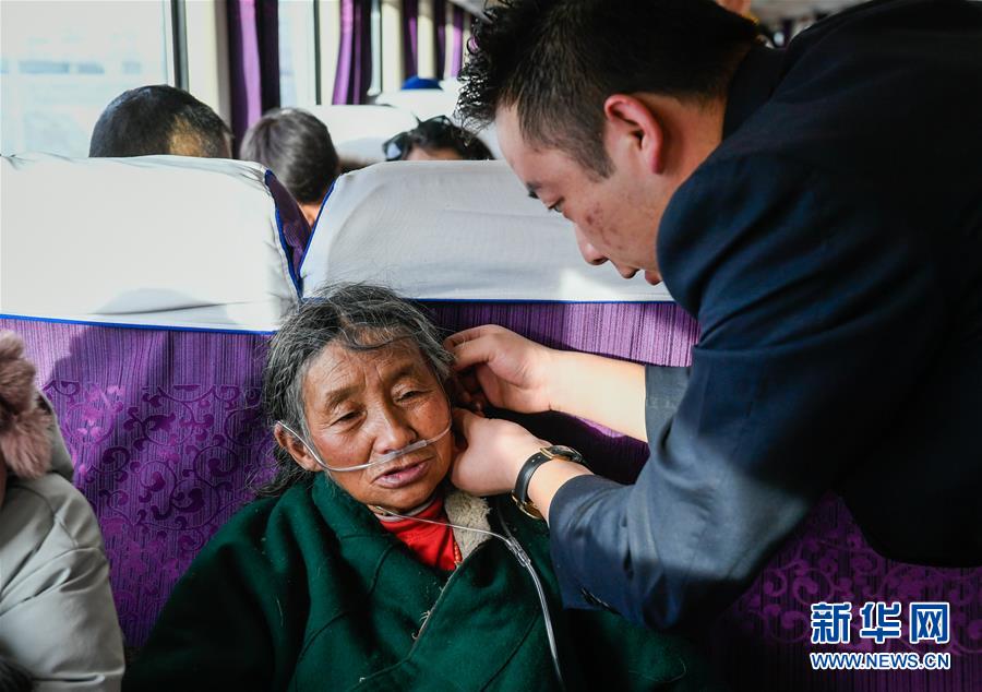 Z6802次列车员为一位老阿妈戴氧气管(1月11日摄)。