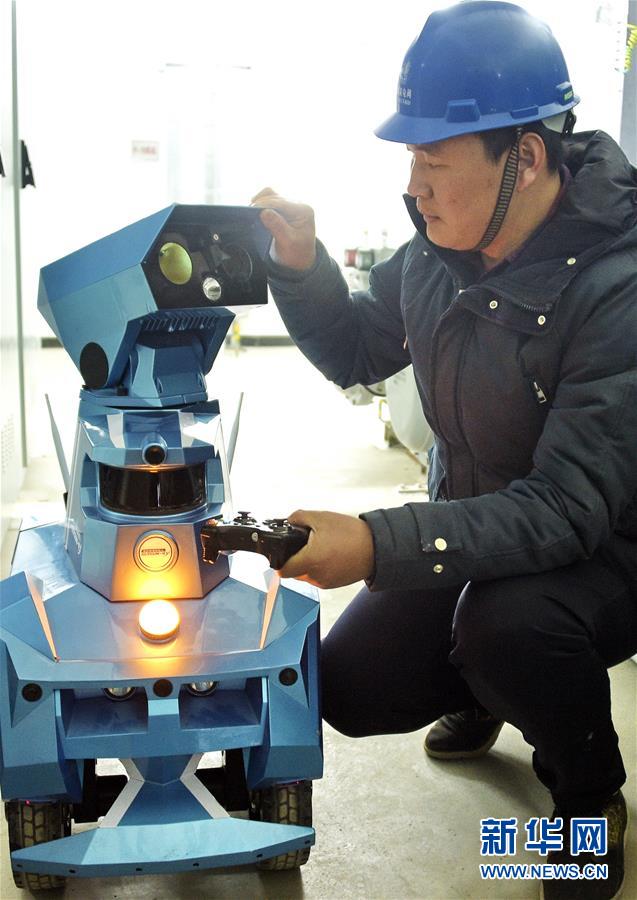 1月12日,国网北京电力的技术人员在调试GIS智能巡检机器人参数。