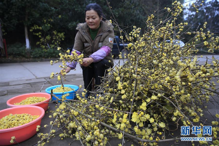 1月12日,在重庆市北碚区静观镇,花农筛选蜡梅花以备酿造使用。重庆市北碚区静观镇蜡梅栽培历史悠久。寒冬,蜡梅开花时节,当地农户将蜡梅花酿造成蜡梅花酒,以提高蜡梅的附加值。蜡梅花酒酿造要经过筛选鲜花、鲜花发酵、花汁分离、澄清汁液、勾兑原酒、储存陈酿、净化过滤、调味定型等工序,酿出的酒具有气味芬芳、滋味甘醇等特点。新华社发(秦廷富 摄)