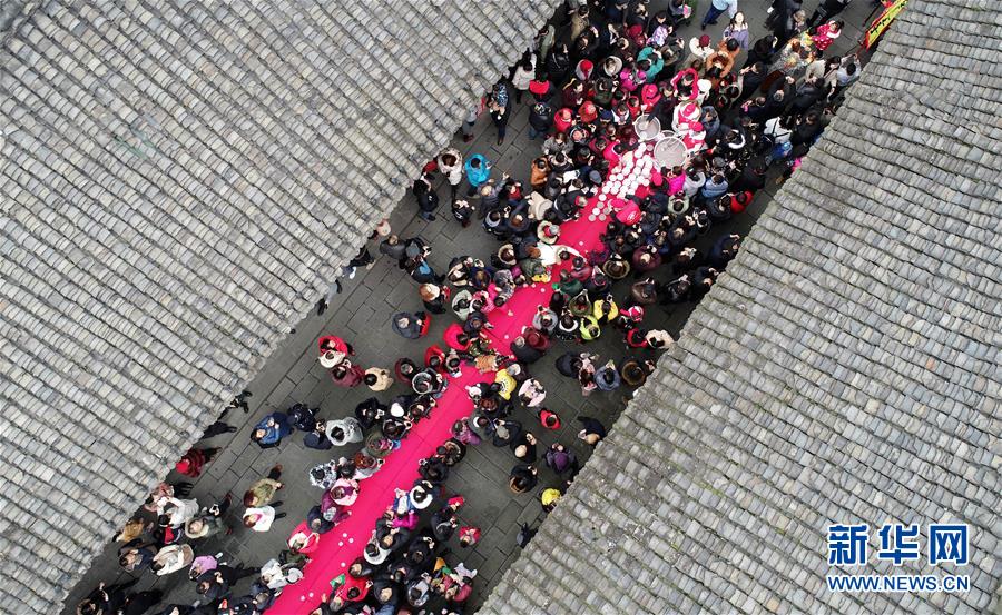 1月13日,在四川阆中古城举行的“万人同品腊八粥”活动上,人们排队品尝腊八粥(无人机拍摄)。