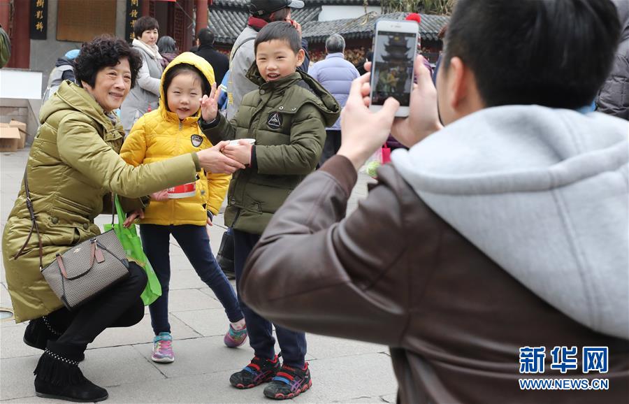 1月13日,人们在上海七宝古镇手捧腊八粥拍照留念。