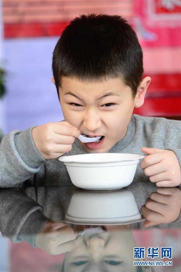 1月13日,乌鲁木齐市博物馆举办“共度腊八迎新春 民族团结一家亲”活动,一名小朋友在活动中品尝腊八粥。