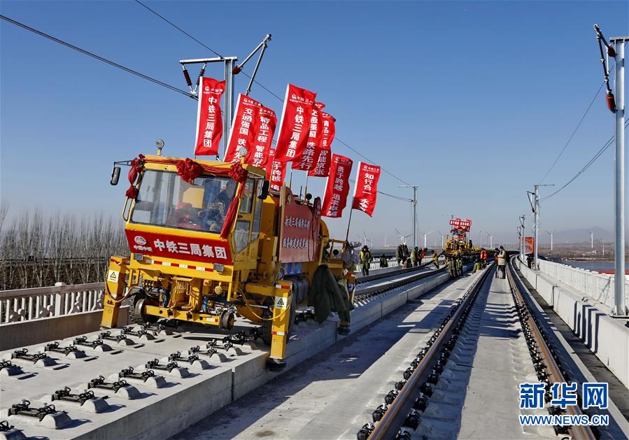 1月13日,中铁三局的工人在京张高铁官厅水库特大桥进行铺轨作业。 新华社记者 杨世尧 摄