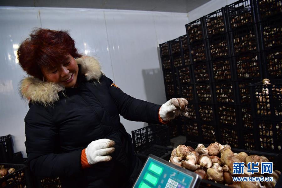 在河南省鲁山县瓦屋镇土桥村,一位村民在冷库内给香菇称重(1月13日摄)。 近年来,位于伏牛山区的河南省鲁山县瓦屋镇土桥村利用气候资源优势,大力发展香菇种植,成为村民脱贫致富的重要抓手。 新华社记者 冯大鹏 摄