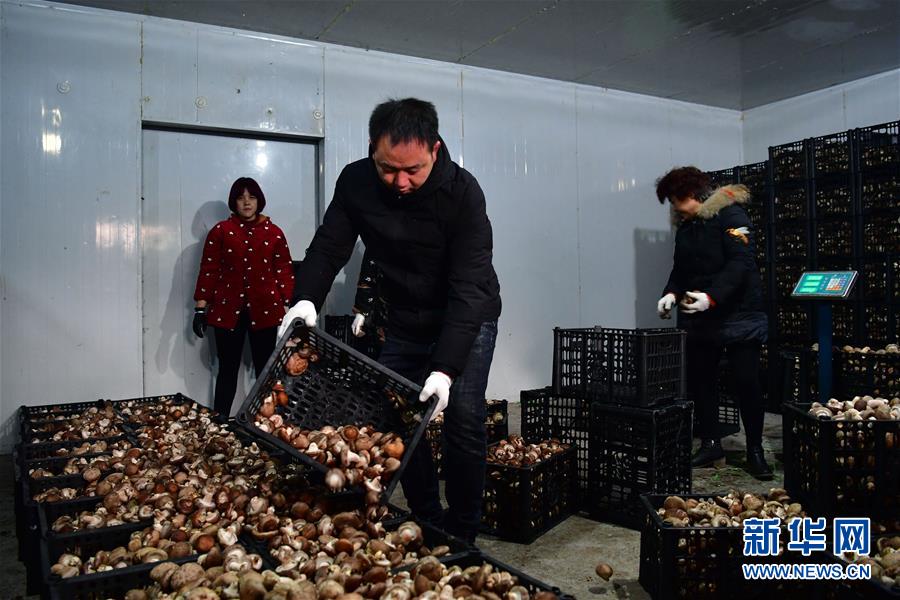 在河南省鲁山县瓦屋镇土桥村,村民们在冷库内整理香菇(1月13日摄)。 近年来,位于伏牛山区的河南省鲁山县瓦屋镇土桥村利用气候资源优势,大力发展香菇种植,成为村民脱贫致富的重要抓手。 新华社记者 冯大鹏 摄