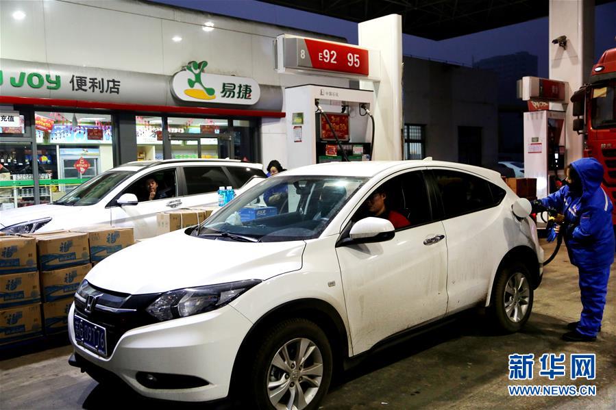 1月14日,车辆在江苏省连云港市连云区一加油站等待加油。 新华社发(王春 摄)