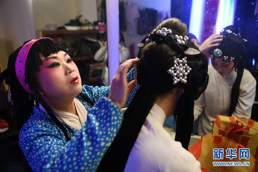 1月14日,在颐融堂戏曲体验馆里,演员在登台前整理发饰。新华社记者 范培珅 摄