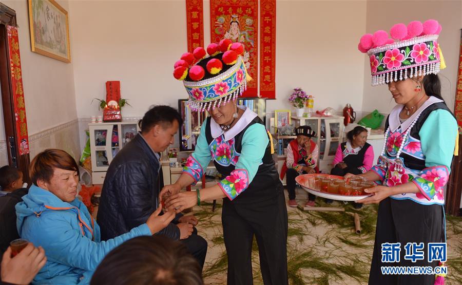 1月14日,周有兰(中)给前来贺喜的村民敬茶。新华社记者 秦晴 摄
