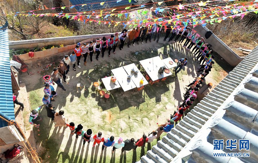 1月14日,村民跳起彝族左脚舞庆贺周有兰一家乔迁新居。 新华社记者 秦晴 摄