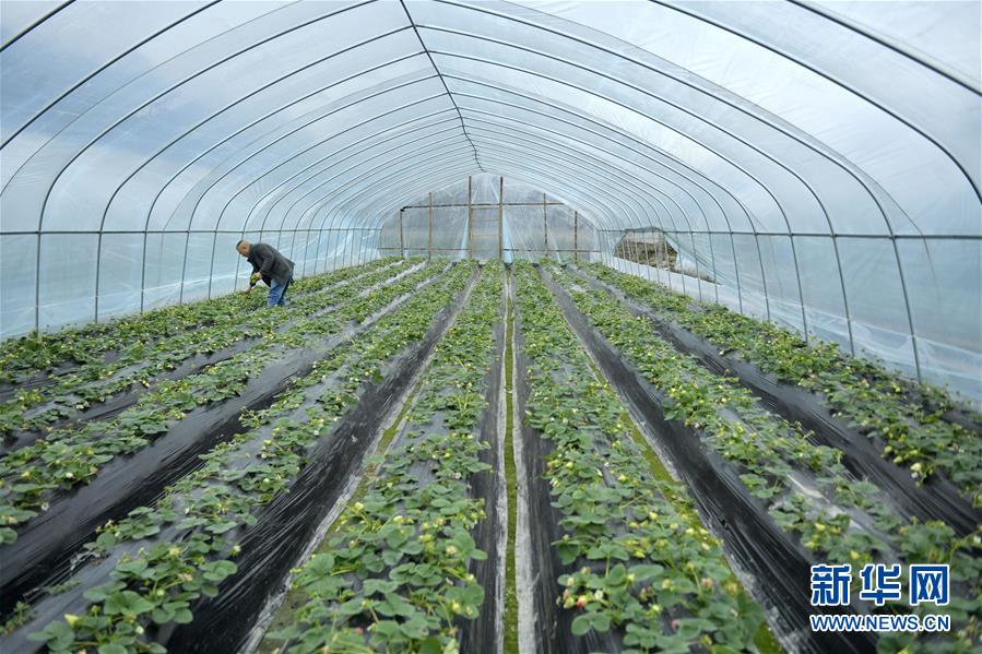 1月14日,宣恩县珠山镇甘溪村农民在草莓大棚内忙碌。新华社发(宋文 摄)