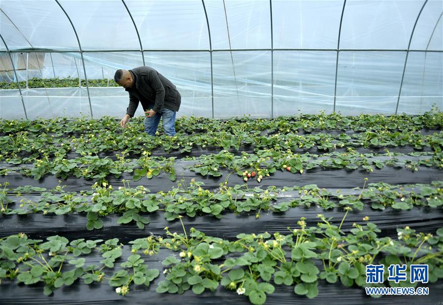 1月14日,宣恩县珠山镇甘溪村农民在草莓大棚内忙碌。新华社发(宋文 摄)