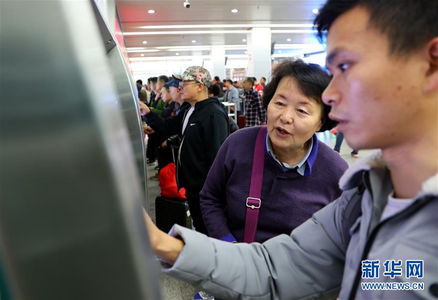 1月15日,广东湛江青年许东滨(右)在广州火车站售票大厅内的自助售票终端上买完车票后,顺便帮助一位老人查询车票信息。 为适应互联网购票旅客比重持续上升趋势,广州火车站在筹备2019年春运票务业务时,优化互联网购票取票和退改签业务办理流程设计,提升效率,方便旅客出行。 新华社记者刘大伟摄