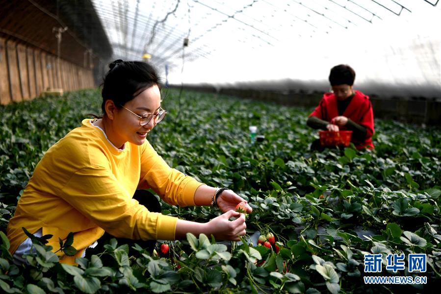 1月15日,在廊坊市安次区杨税务乡一草莓采摘园,游客在采摘草莓。