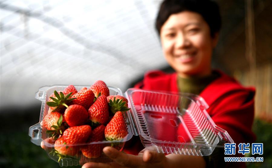 1月15日,在廊坊市安次区杨税务乡一草莓采摘园,游客展示采摘的草莓。