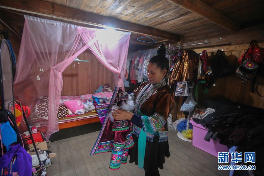 1月15日,在广西融水苗族自治县融水镇梦呜苗寨一处吊脚楼内,居民在房间整理衣服。新华社记者 陈君清 摄
