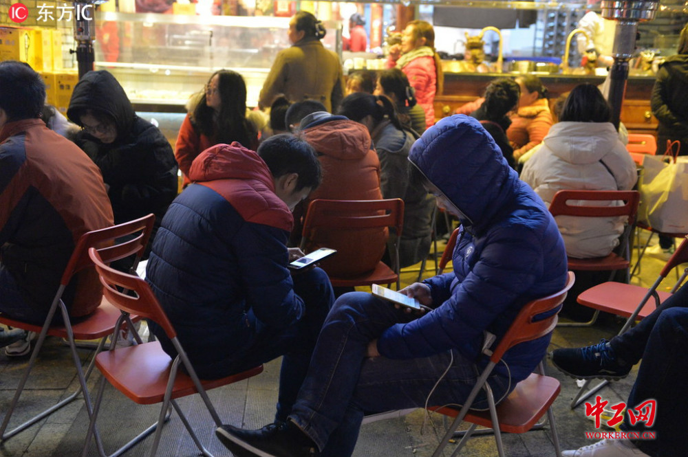 2019年1月13日,四川成都三圣街一火锅店举行免费吃火锅活动,排队的市民裹着厚厚的衣服玩着手机等候。